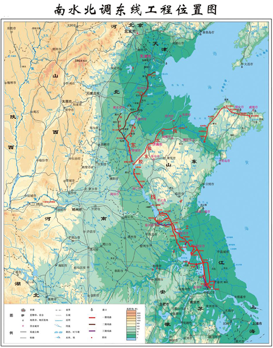 南水北調東線工程是利用江蘇省已有的江水北調工程,逐步擴大調水規模并延長輸水線路。東線工程從長江下游江蘇省揚州市江都區抽引長江水,利用京杭大運河及與其平行的河道逐級提水北送,并連接起調蓄作用的洪澤湖、駱馬湖、南四湖、東平湖。出東平湖后分兩路輸水:一路向北,在位山附近經隧洞穿過黃河,輸水到天津;另一路向東,通過膠東輸水干線經濟南輸水到煙臺、威海。東線工程調水規模為148億立方米,規劃分三期建設。