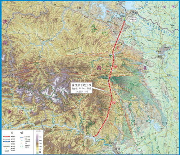 引江補(bǔ)漢工程作為南水北調(diào)中線后續(xù)水源工程,從長江三峽庫區(qū)引水入漢江,沿線由南向北依次穿越宜昌市夷陵區(qū)、襄陽市保康縣、谷城縣和十堰市丹江口市。主要包括輸水總干線工程和漢江影響河段綜合整治工程,為有壓單洞自流輸水,多年平均調(diào)水量為39億立方米,引水流量隨三峽水庫水位變化為170~212立方米每秒。工程施工總工期108個月,工程靜態(tài)總投資551.58億元。