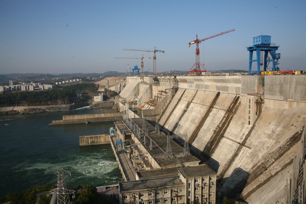 丹江口大壩加高工程位于湖北省丹江口市境內漢江干流與其支流丹江匯合口下游800米處,是在原有壩體上進行混凝土培厚加高,包括混凝土大壩加高和心墻土石壩加高。大壩加高工程完建后,壩頂高程由目前的162米增加到176.6米,壩頂軸線長3442米,正常蓄水位由157米抬高至170米,可相應增加庫容116億立方米。混凝土大壩加高中,由于新老混凝土彈性模量的差異,在內外部溫差的作用下,對新老混凝土結合面和壩體應力產生不利影響。在進行大量計算分析研究的基礎上,結合大量試驗室和施工現場原位試驗,提出了滿足設計要求的新老混凝土結合的具體結構措施。在不影響大壩正常運行情況下,完成混凝土大壩裂縫檢查、修補和大壩加高,其建設難度在大壩加高史上可謂世界之最。
