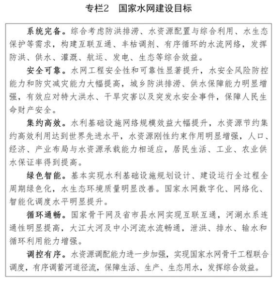 到2025年,建設一批國家水網骨干工程,國家骨干網建設加快推進,省市縣水網有序實施,著力補齊水資源配置、城鄉供水、防洪排澇、水生態保護、水網智能化等短板和薄弱環節,水旱災害防御能力、水資源節約集約利用能力、水資源優化配置能力、大江大河大湖生態保護治理能力進一步提高,水網工程智能化水平得到提升,國家水安全保障能力明顯增強。