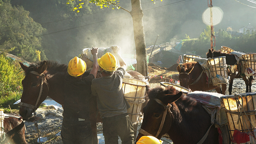 開工初期,征盡周邊區縣騾馬,仍然不能滿足用工需求。為搶進度,建管二部經多方協調,積極在云貴川等省份跨省調運騾馬,累計已投入140匹,每匹騾馬1次可馱運物料200公斤。