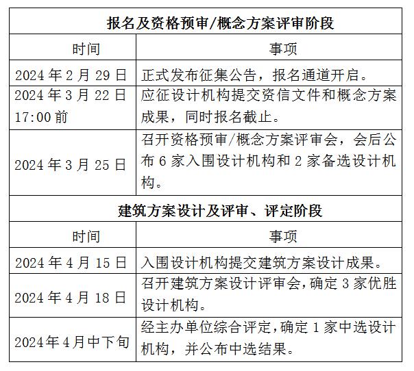 本次征集采用公開報名的方式,征集分“報名及資格預審/概念方案評審”、“建筑方案設計及評審、評定”兩個階段: