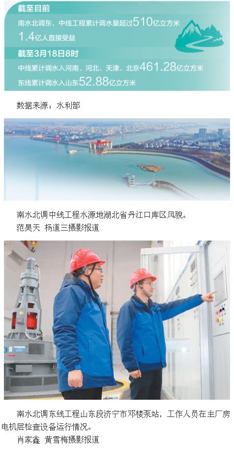南水北調東、中線一期工程自2014年12月全面通水以來,目前累計調水量突破510億立方米。工程的實施改變了廣大北方地區的供水格局,優化了40多座大中型城市的經濟發展格局,1.4億人直接受益,同時推動復蘇受水區河湖生態環境,發揮了巨大的經濟、社會和生態效益。