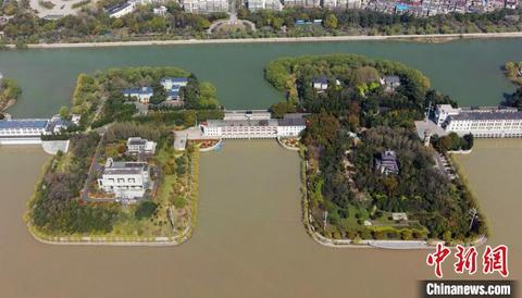 航拍江都水利樞紐,水清岸綠,春景如畫。 孟德龍 攝