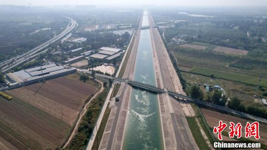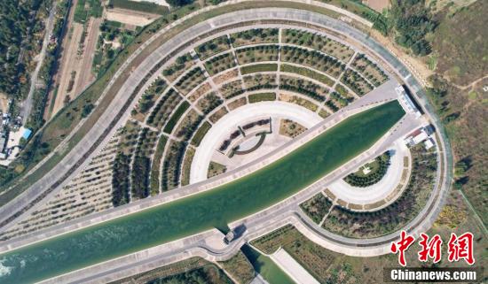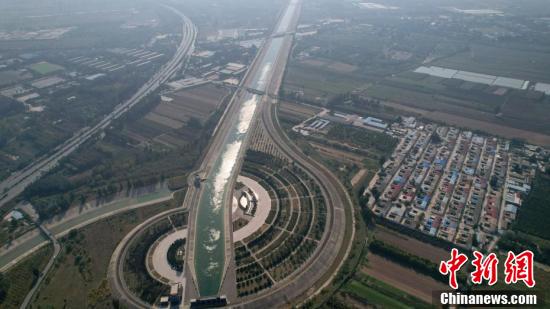 日前,記者隨“奇跡中國 天河筑夢”南水北調中線工程網絡主題活動采訪團,來到河北省石家莊市西北部正定縣西柏棠鄉新村,南水北調中線總干渠在這里通過滹沱河倒虹吸工程穿河而過。據介紹,該工程是南水北調中線干線工程上一座大型渠穿河交叉建筑物,與全線其他一系列控制性工程一起,承擔著總干渠的輸水調度任務。圖為航拍位于石家莊的南水北調滹沱河倒虹吸工程。(中國互聯網發展基金會中國正能量網絡傳播專項基金資助支持)(無人機照片)